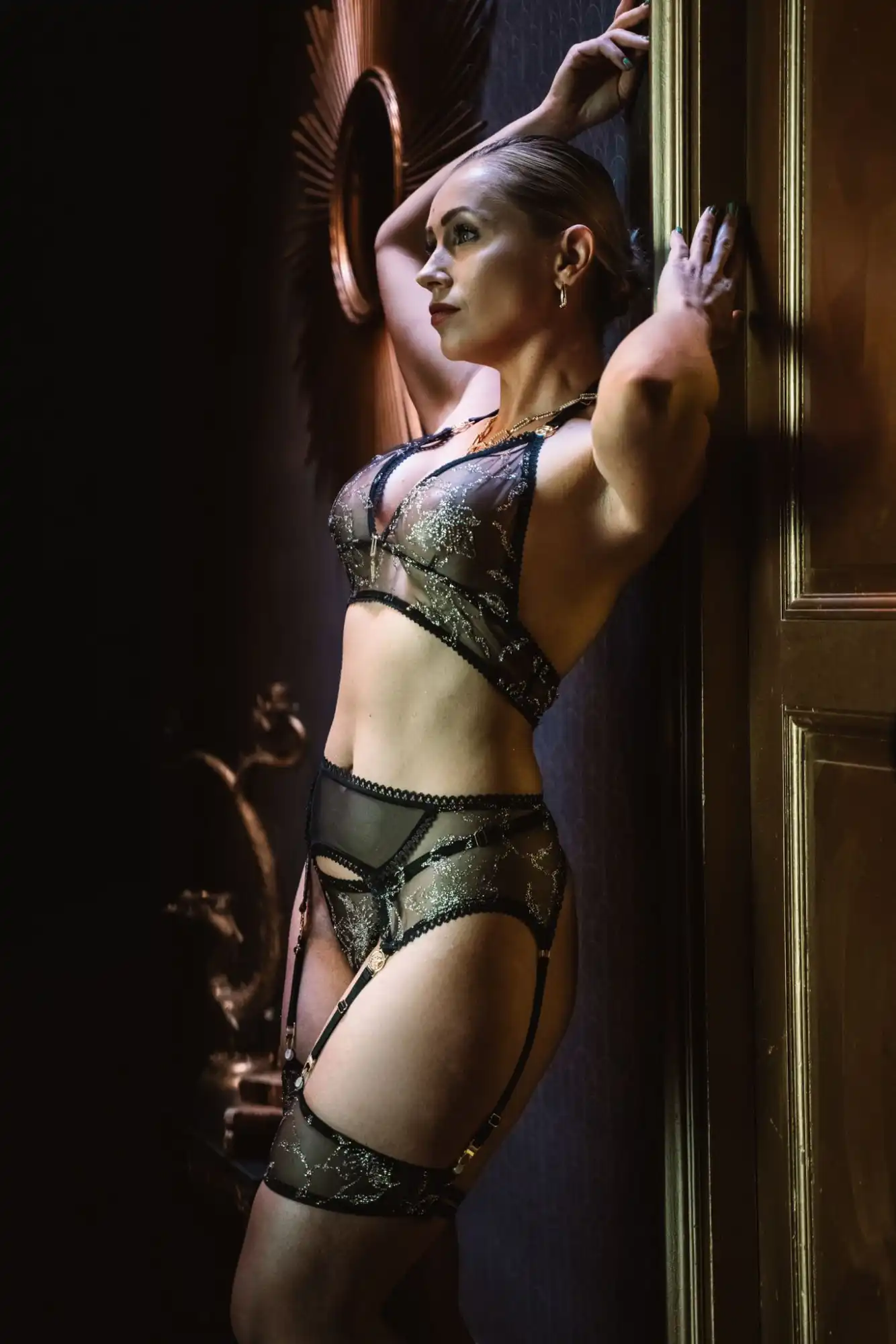 Le porte-jarretelles Anne Arroyo Créations est une pièce maîtresse de l’ensemble, pensée pour structurer la silhouette et apporter une dimension encore plus élégante, sculpturale et couture.